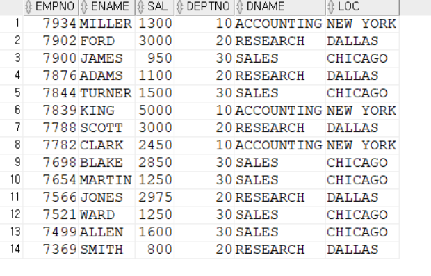 SELECT EMPNO, ENAME, SAL, DEPTNO